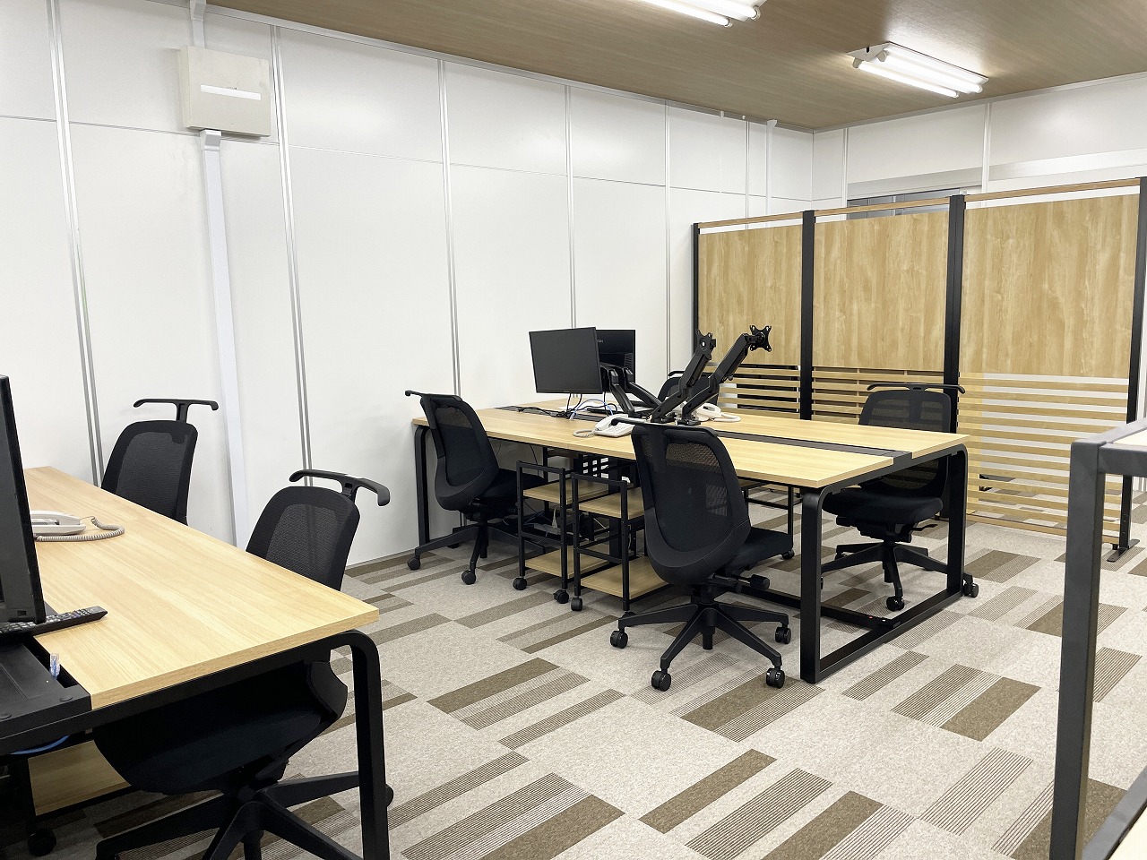 ご担当者様との数度のヒアリングを経て、床面は落ち着きのある印象のタイルカーペットに変更し、事務机をフリーアドレスでの運用を想定した机に変更しました。