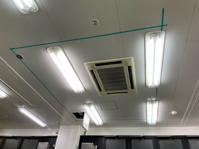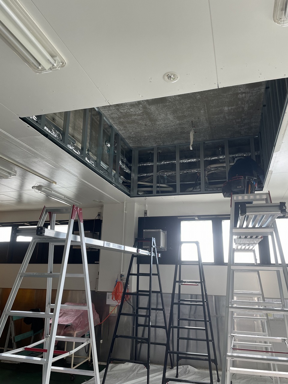 既設天井を解体し、配管・配線を移設、天井側面はケイカル板を貼り、天井は塗装させていただきました。